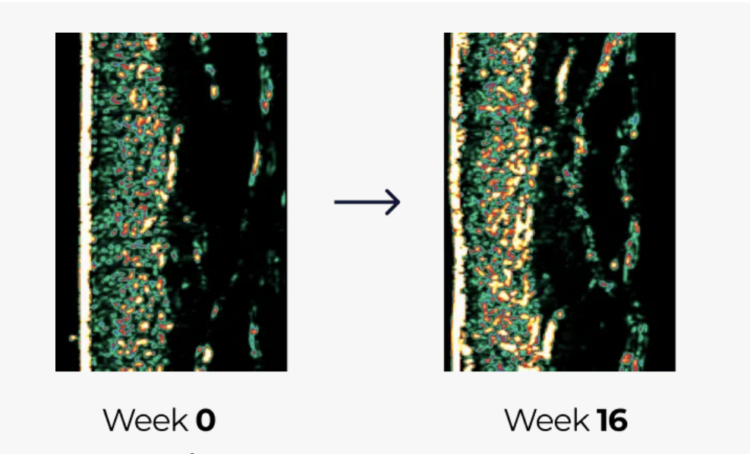 Ultralydbildet viser lærhuden (dermis) før og etter 16 ukers bruk. Jo lysere og tettere struktur, desto sterkere og fastere hud.