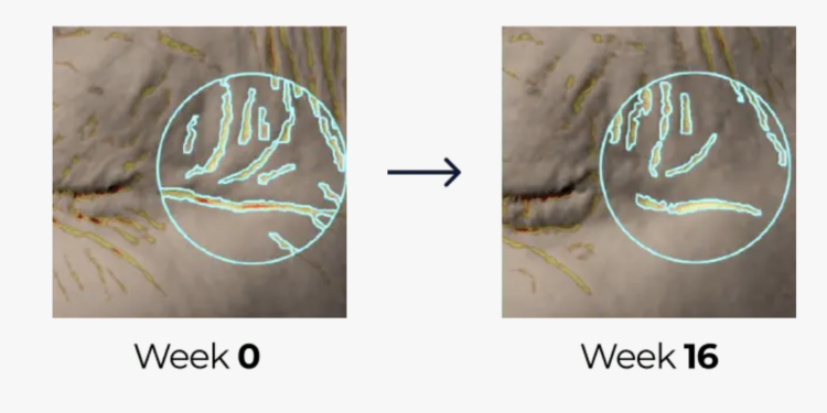Bilde fra kinnet viser hudens overflate før og etter. Falskfargede kart markerer røffe områder i rødt og jevne områder i blått/lilla. Etter 16 uker er huden jevnere og glattere